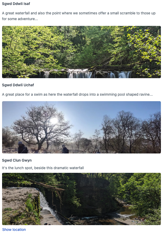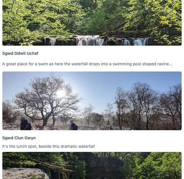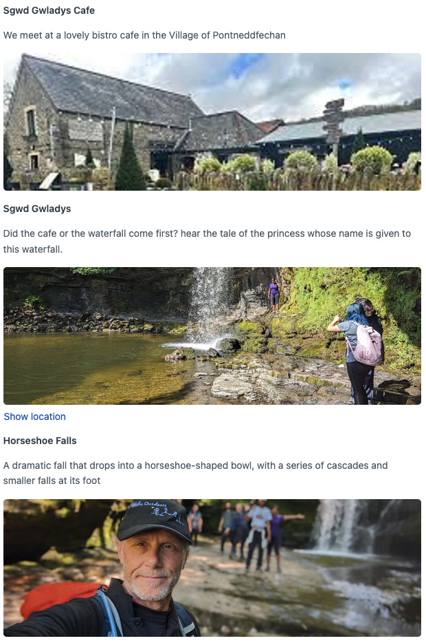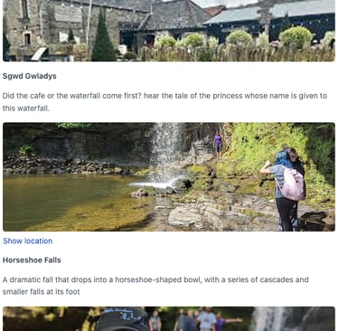 Meet your guide in a fine bistro cafe in the village of Pontneddfechan. Perhaps you will choose to have breakfast here? We will then, hike to, and visit each waterfall as you learn about the local area from your guide. You'll gain 400m of height on the 15km hike, which is often over rough, muddy and broken ground. For our hiking troubles, we get amazing scenic views of the park and wonderful memories of sparkling waterfalls. See the waterfalls hike itinerary.