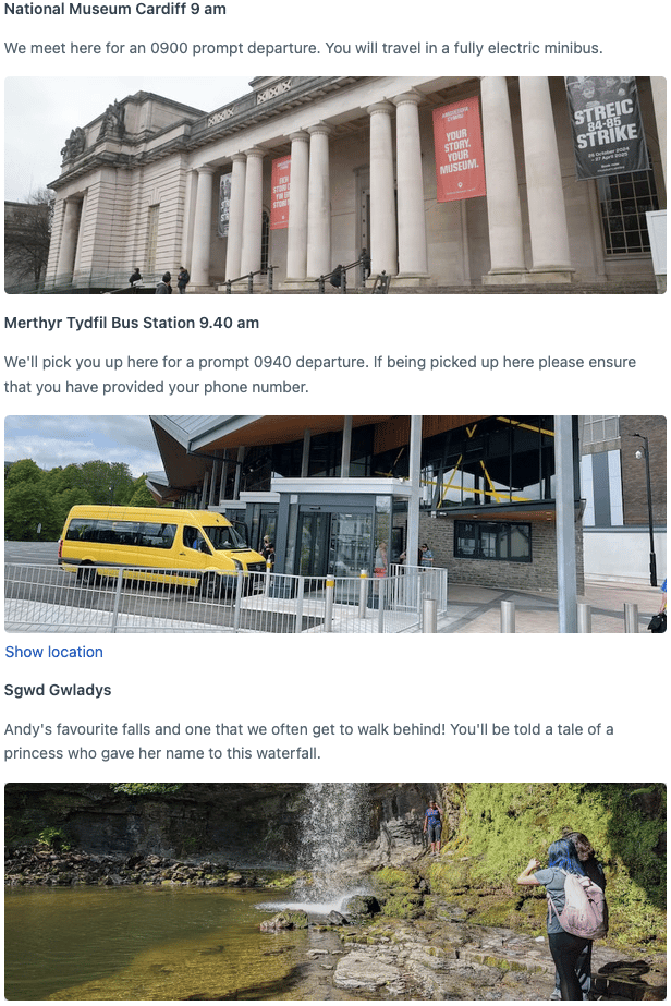You will travel in a modern and luxurious fully electric vehicle, limited to a maximum of seven passengers, in the company of your driver guide, Andy, who is a Mountain Leader and a Green Badged Tourist Guide, an ambassador for many areas of Wales and a Visit Wales Pro, he’s also been chair of Brecon Beacons Tourism and a Brecon Beacons National Park Warden. See the waterfalls hike itinerary.